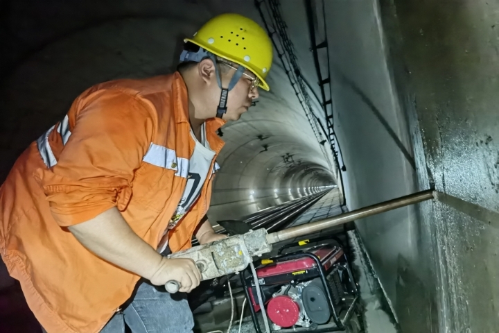 铁路桥梁工对铁路隧道边墙进行钻孔泄压作业。 姚良 摄