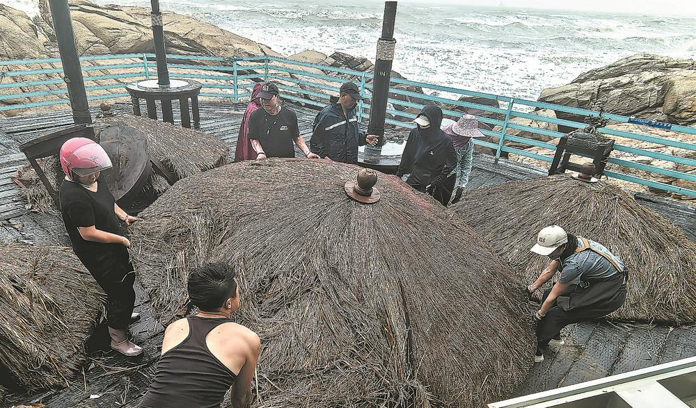 26日上午,惠安县崇武镇惠女风情园内,工作人员加紧清理被台风“格美”破坏的基础设施。福建日报通讯员 曾梅霞记者 黄琼芬 摄