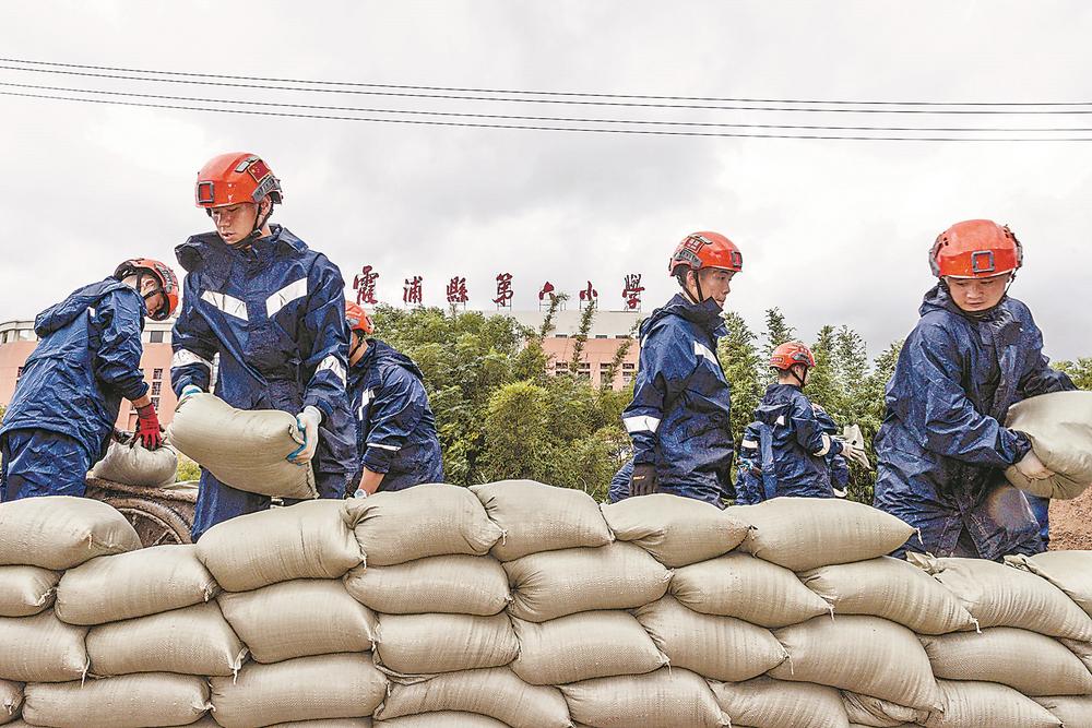 南平市森林消防支队50余名指战员闻讯而至,与村民们一起在村庄与河流的交界处用沙袋筑起200余米的临时堤坝,并用应急水泵抽排村内积水。福建日报记者 林熙张永定 摄