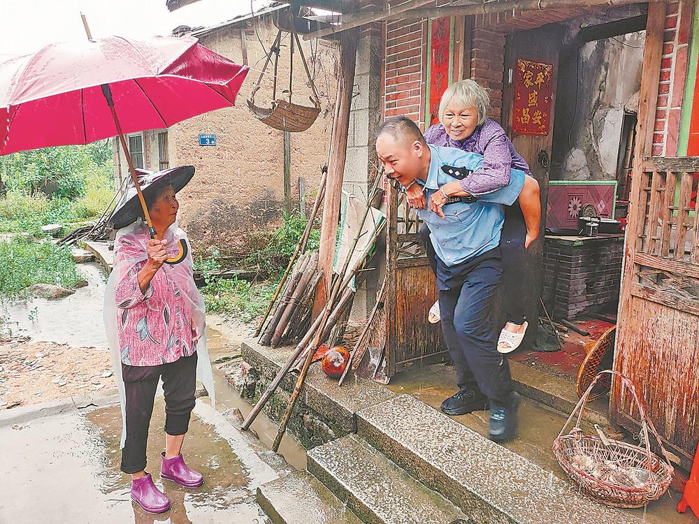 26日下午,平和县公安局芦溪派出所民警背起受伤老人,转移到安全的地方。福建日报通讯员 陈帅涵 摄