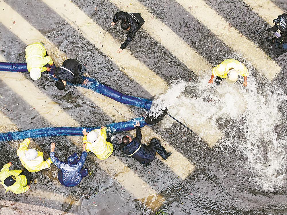 26日,台风“格美”带来的强降雨导致霞浦县城部分区域发生内涝。霞浦县城管、应急、交警等部门工作人员在城区积水点疏通下水道、抢排积水,全力恢复生活生产秩序。福建日报记者 林熙 张永定 摄