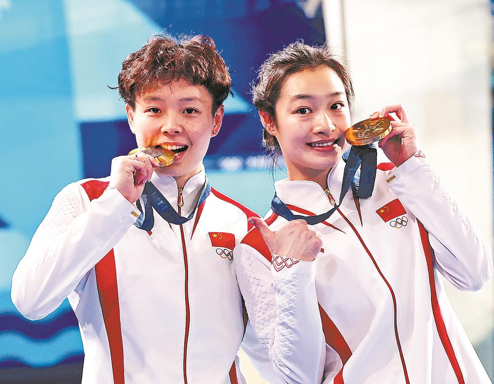27日,获得跳水女子双人3米板冠军的中国选手昌雅妮(右)/陈艺文,身着安踏领奖服在颁奖仪式上。新华社发