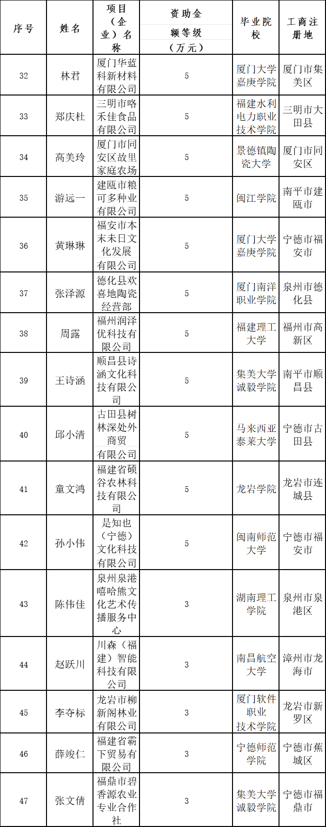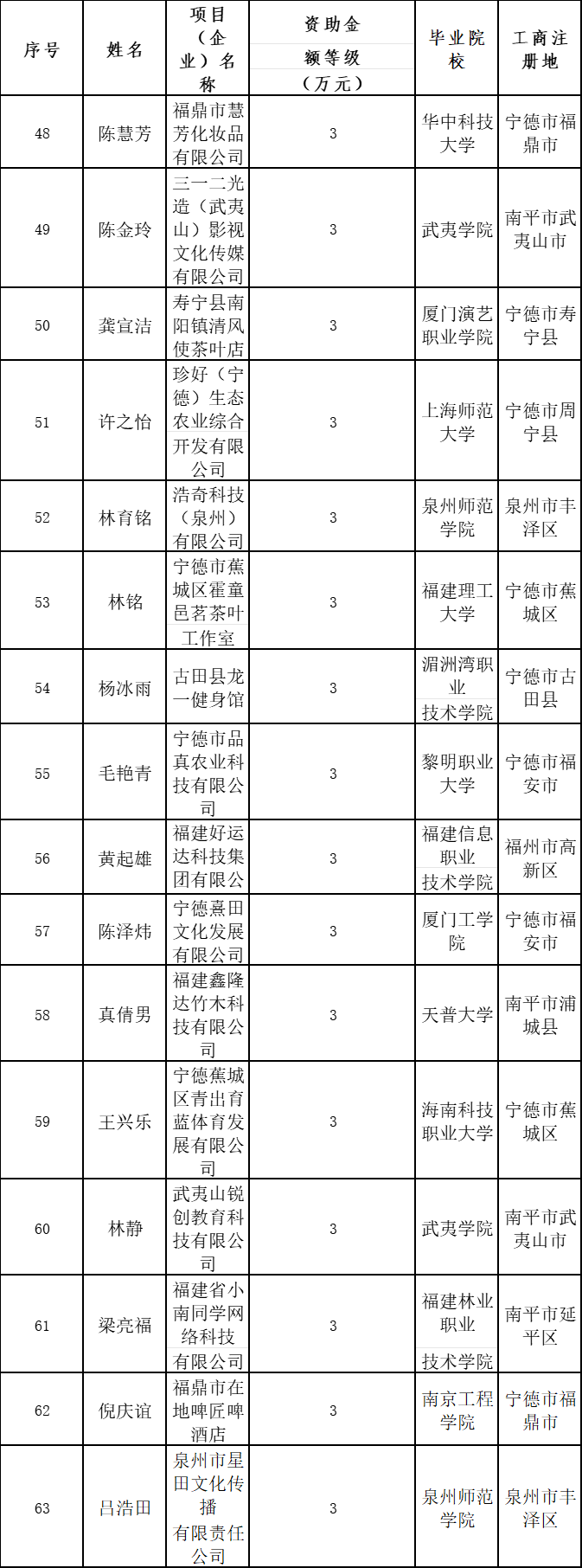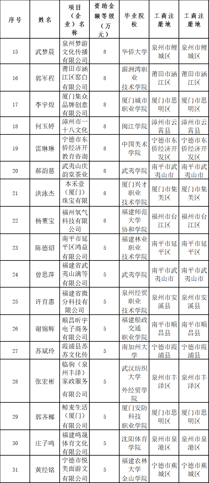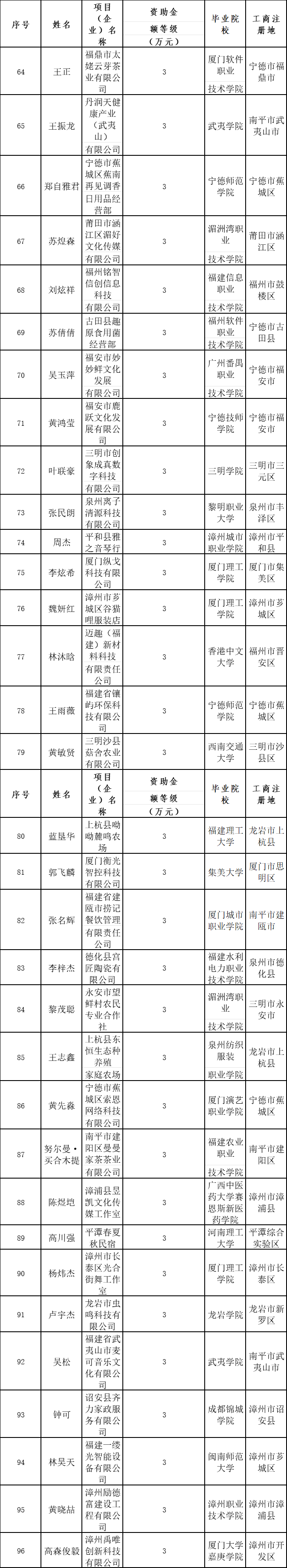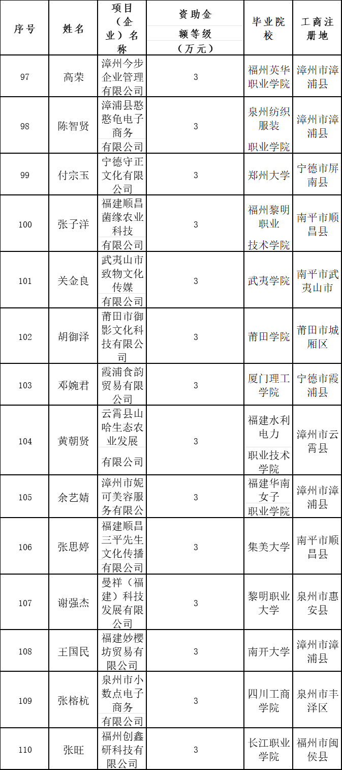 2024年福建省大中专毕业生创业省级资助项目名单