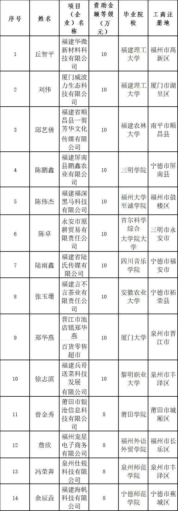 根据《福建省人力资源和社会保障厅办公室关于做好2024年大中专毕业生创业省级资助项目申报评审工作的通知》(闽人社办〔2024〕26号),今年全省共征集申报项目1429个,经资格审核、书面评审、实地考察、现场答辩和网上公示等程序,确定福建华微新材料科技有限公司等110个项目为2024年全省大中专毕业生创业省级资助项目(名单附后),每个项目给予3万-10万元资助,现予以公布。