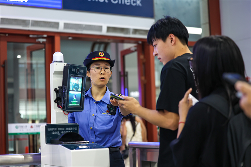 中国铁路南昌局集团有限公司福州车务段福清西站客运值班员程岩在检票口为旅客检票核验信息 (王勇富 摄)