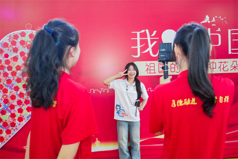 大学生在“祖国花朵种花朵”祝福墙前合影留念