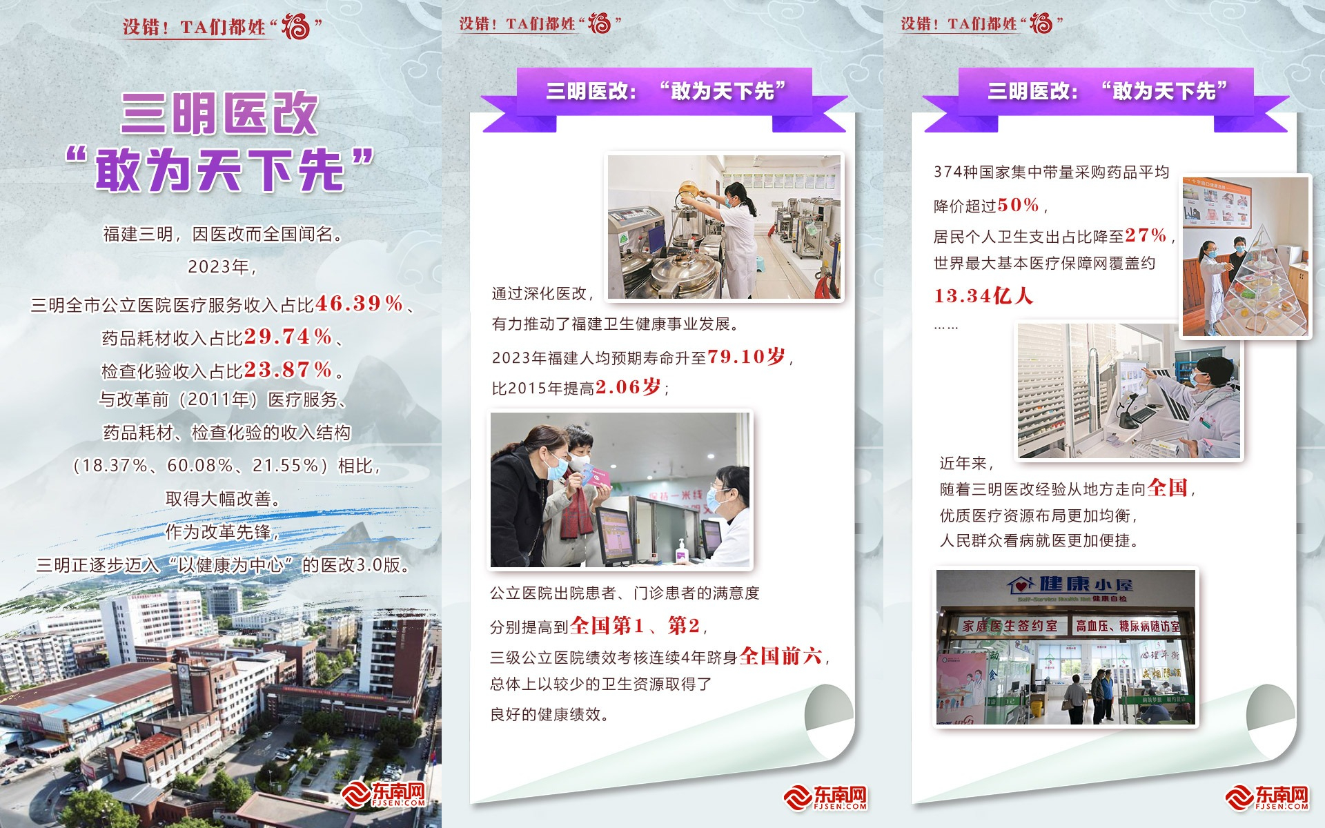 2012年以来,三明坚持医药、医保、医疗“三医联动”的改革路径,始终不改“三个回归”的初心:让公立医院回归公益性质,让医生回归看病角色,让药品回归治病功能,闯出了一条破解医改难题的新路子。