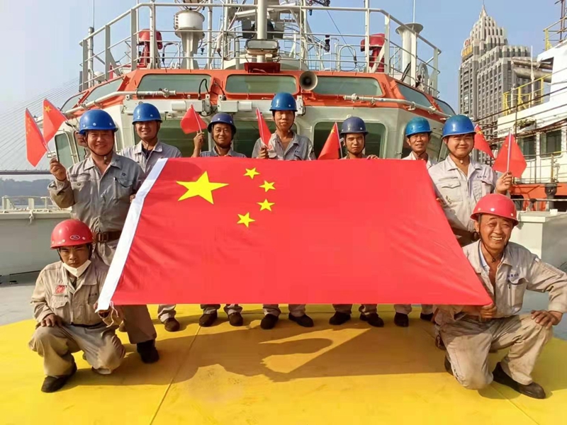 在连江粗芦岛船舶工业园区,马尾造船厂员工与国旗合影,庆祝新中国成立75周年,共同祝福伟大祖国生日快乐。