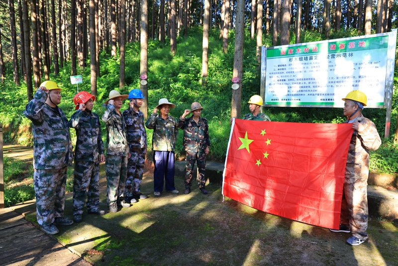 福建省洋口国有林场职工在杉木基地林区园,以深山护林者的形象,高举国旗,庆祝中华人民共和国成立75周年。