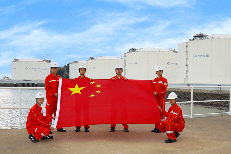 国庆前夕,在莆田市湄洲湾港的福建LNG接收站,工作人员巡检结束后,在LNG罐体前与国旗合影,庆祝中华人民共和国成立75周年,表达对伟大祖国的无限热爱和深情祝福。