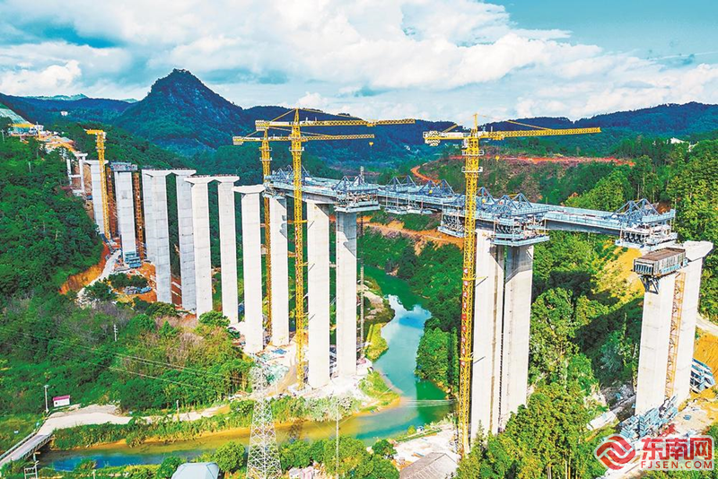 近日,位于德化县境内的政(和)永(定)高速公路德化段项目,工人在全线最高桥墩洋中2号桥梁进行浇筑箱梁施工。政永高速德化段全长39.949公里,概算总投资67.43亿元,建设期3年。截至9月,已完成年度投资13.57亿元,占省级年度计划的75.44%。(许华森 摄)