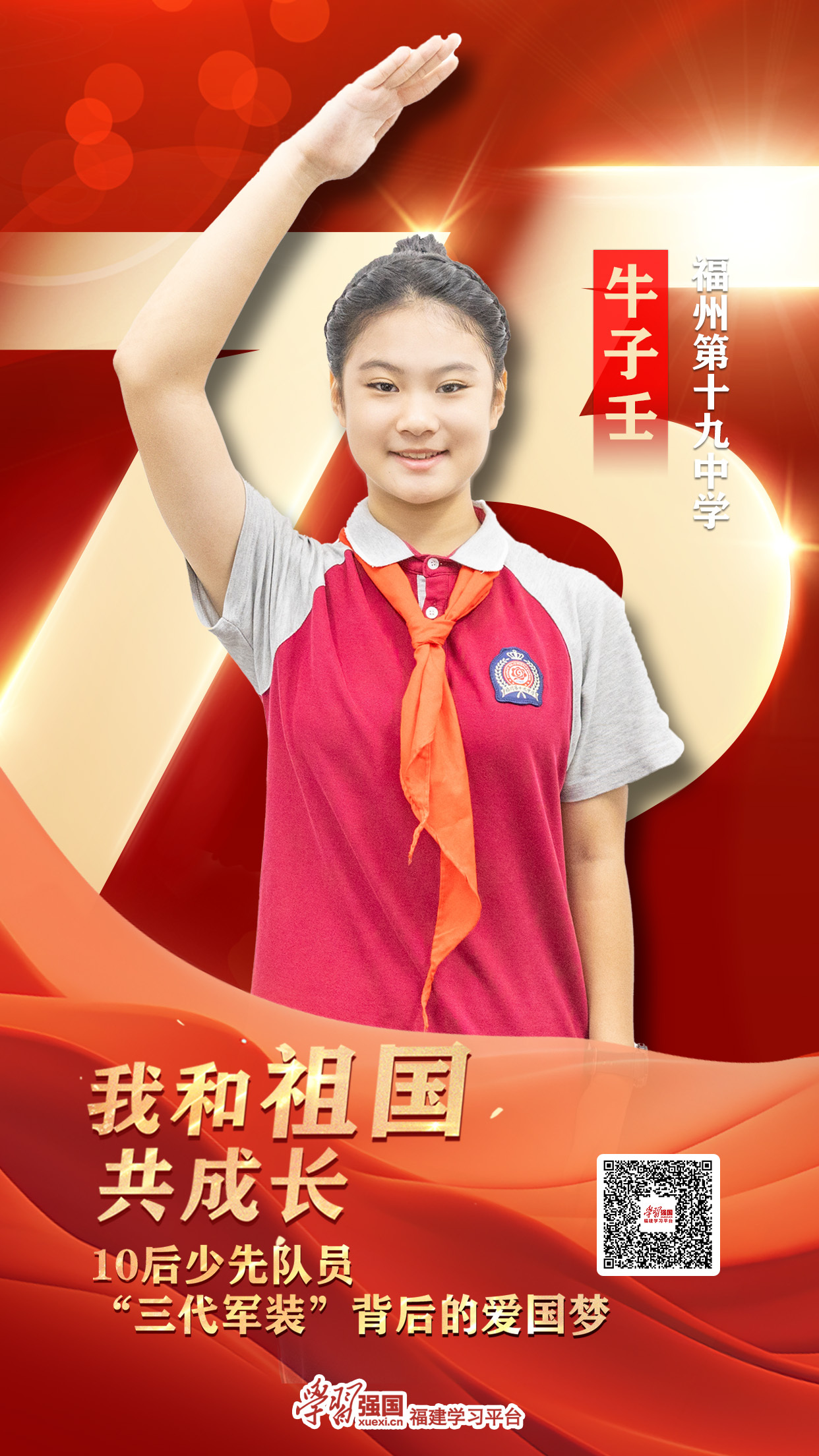 少年不惧岁月长,彼方尚有荣光在。如今,牛子壬是少先队福州第十九中学大队的大队长。忙碌的学习生活中,她仍怀揣着热腾腾的初心,沉甸甸的抱负。