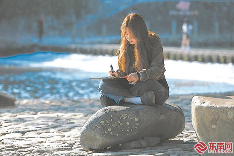 女生聚精会神地描绘云水谣景区的诗情画意。