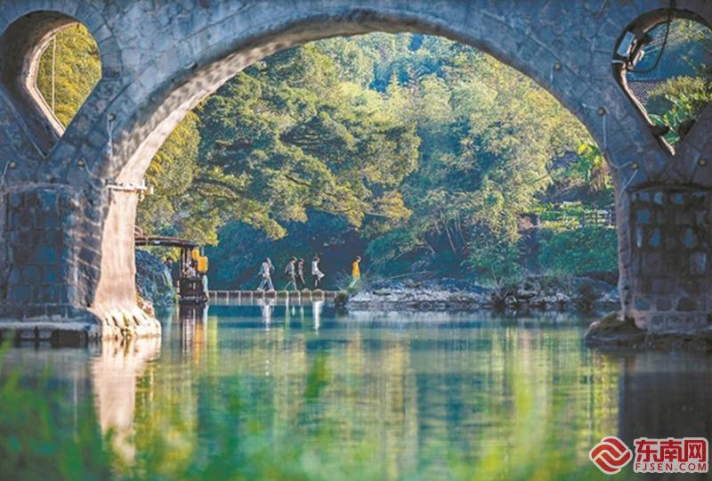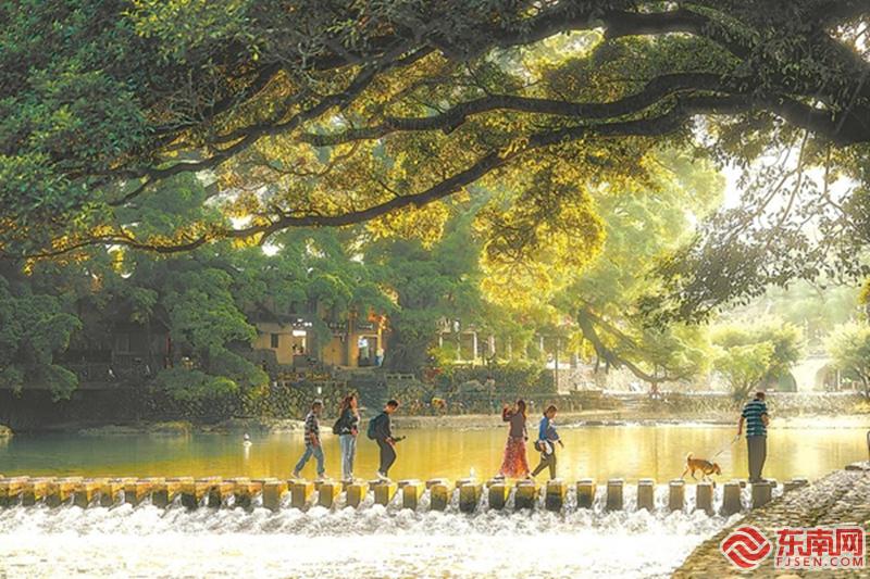 船场溪蜿蜒流过官洋村,溪旁老榕状如华盖,游客通过“石跳”走到对岸去。