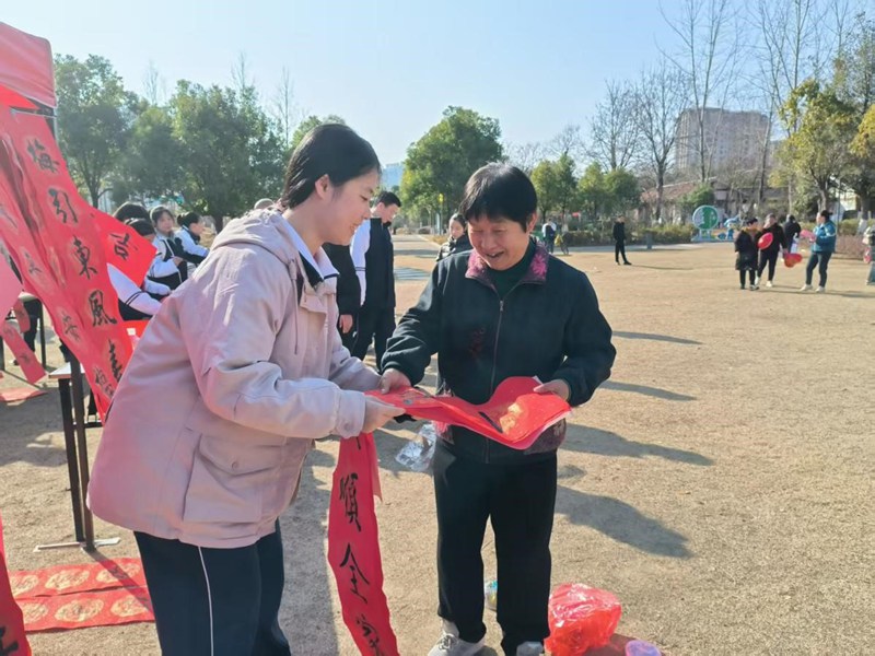 图为群众欣喜地接过学生们为其“量身定制”的新春对联。