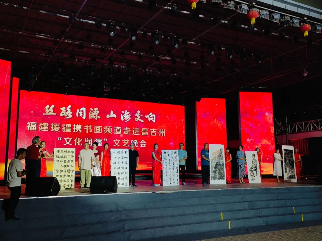 2024 年 7 月 23 日至 27 日,“丝路同源 山海交响” 福建援疆携书画频道走进昌吉的 “文化润疆” 大型系列活动,在昌吉盛大举行。活动形式丰富多样,涵盖了广场文艺晚会、书画名家作品展览、名家大讲堂等多个板块。同时,艺术家们走进社区、学校、企业深入交流互动,开展了采风写生、名家笔会等活动。活动致力于推动中华优秀传统文化的创造性转变与创新性发展,力求将文化润疆项目打造成极具影响力的文化名片,让文化润疆的成果惠及更多百姓。