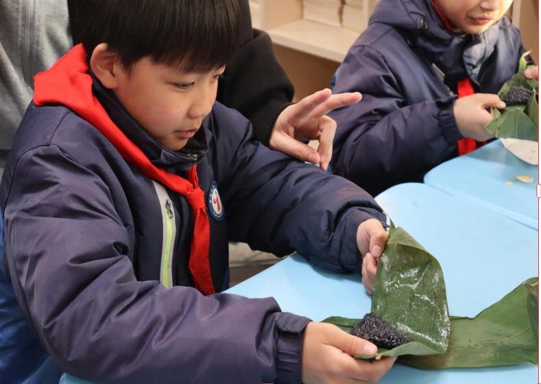 志愿者教同学们制作乌米粽子
