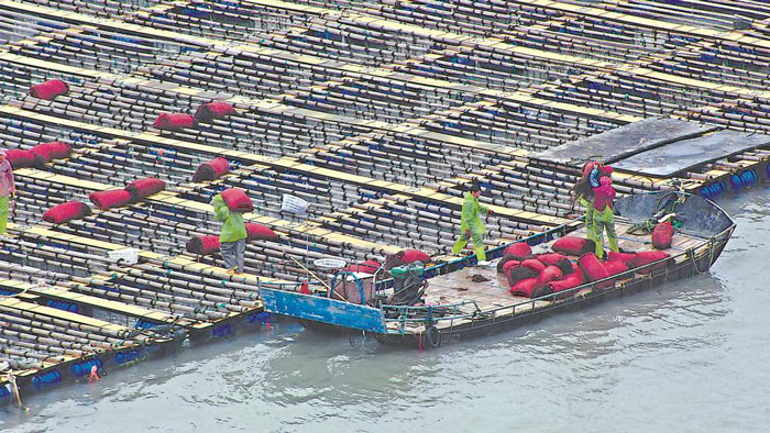 眼下正值龙须菜采收季,连日来,位于莆田市秀屿区南日海域的“国家级海洋牧场”,一派丰收的繁忙景象。渔民乘着小船穿梭渔排间,在采收装船之余,将收获的部分龙须菜投喂给在海面养殖的鲍鱼。陈汉儿 杨斌伟 摄