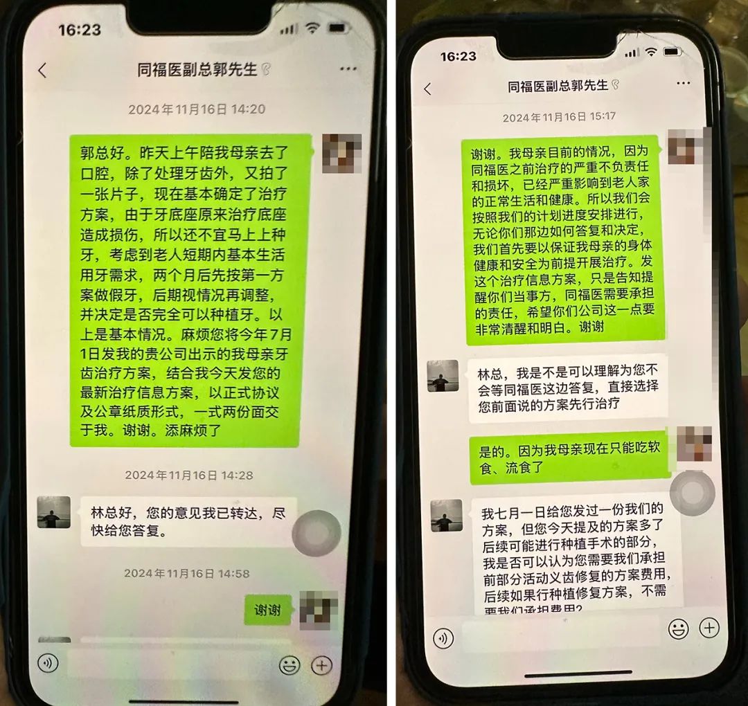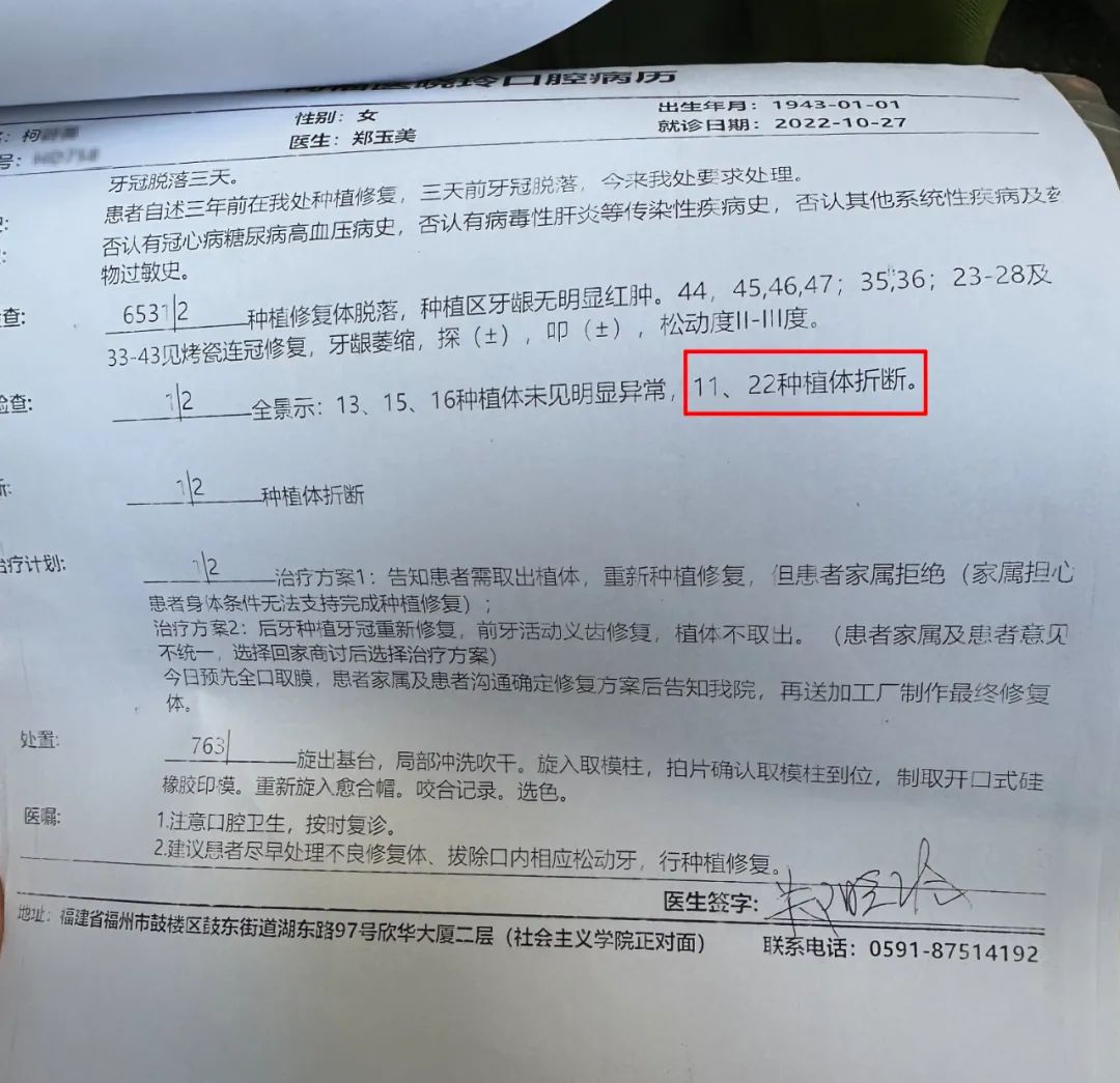 “我母亲当时80岁高龄,一次性拔那么多颗牙做种植牙,并且还在装上牙冠之后问题频发,折腾了这么多年,现在又发现种植体断裂。我认为同福医从前期术前检查、种植牙选材和技术,以及服务态度都有很大的问题,我们高度怀疑这是一起医疗事故,同福医郑晓玲院长应该出面跟我们道歉,并且由同福医承担我母亲的全部治疗费用。”林先生称,他将诉求告知郭副总后,对方表示会向公司反映并持续跟进,但随后3个多月杳无音讯,近日连电话也无人接听。