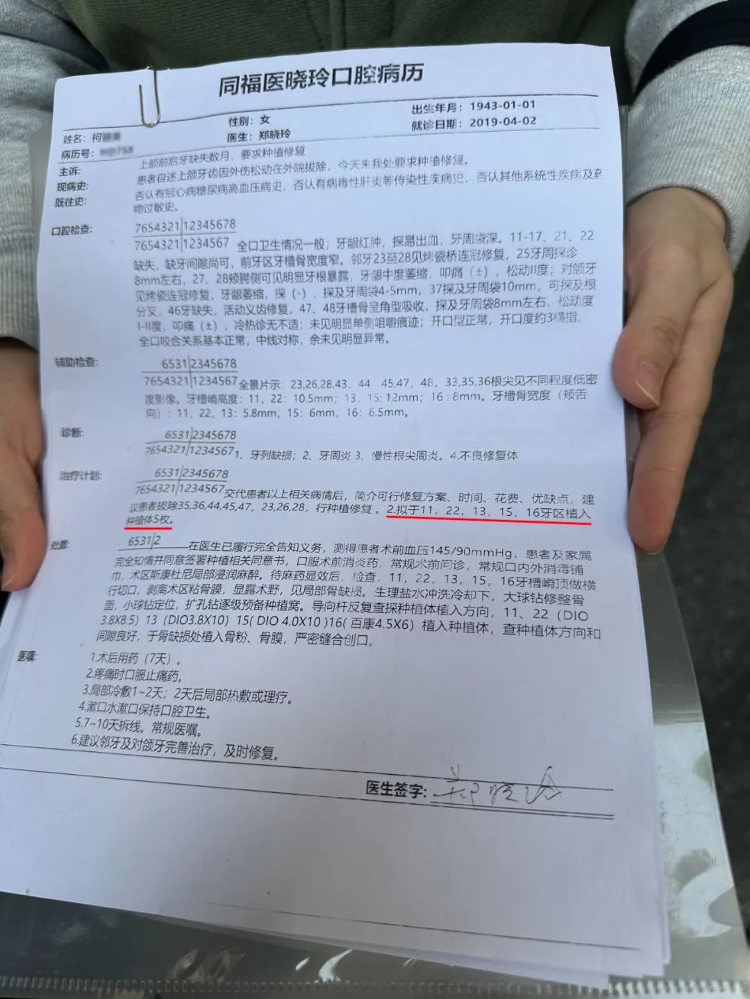 2019年4月2日的同福医病历显示,建议柯女士拔除8颗牙,种入5枚种植体。海峡网记者 李牧晨 摄