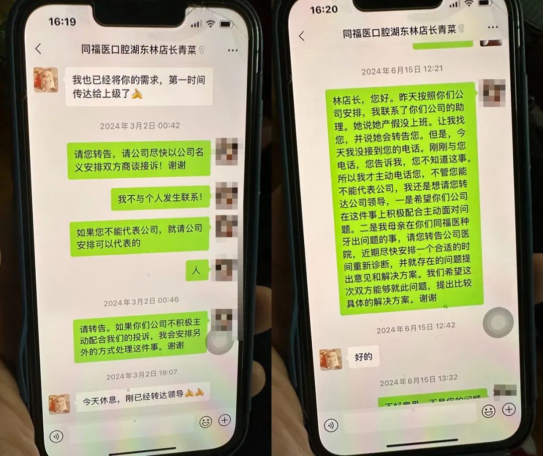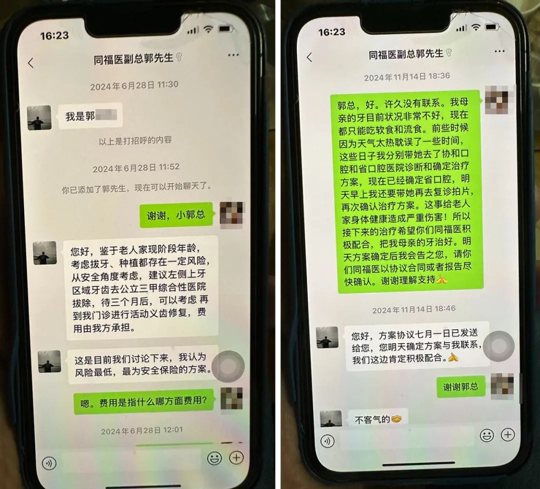 “从3月到6月,一位林姓店长一直跟我道歉,表示会向上汇报,但始终没有下文。”林先生说。直到6月底,另一位郭姓副总经理才与林先生对接。郭提出,考虑到柯女士现阶段的年龄因素,在治疗过程中可能存在一定风险,建议柯女士先去公立三甲医院拔除左侧上牙区域的牙齿,待三个月后再考虑由同福医修复,费用由同福医承担。