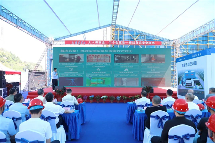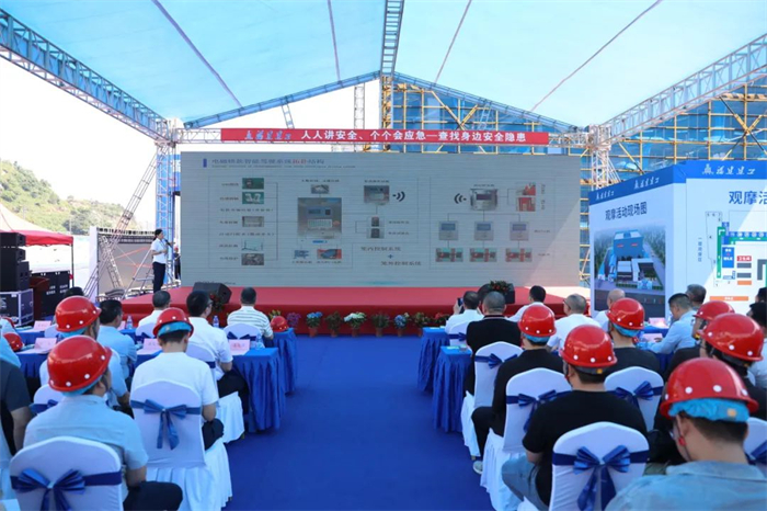 本次观摩活动内容丰富,设置了技术交流与实景演示两大环节,涵盖了智能施工升降机应用、高处作业安全精准化防控等多个方面。项目管理人员与行业专家围绕设备自检、风险分级管控等关键内容展开深入探讨和交流,分享了设备运行监测、风险预警及应急处置等核心内容,并现场展示了智能施工升降机在识别到人员未佩戴安全帽、超载等不规范行为所作出的警示及停运,为现场人员带来了别开生面的安全体验。