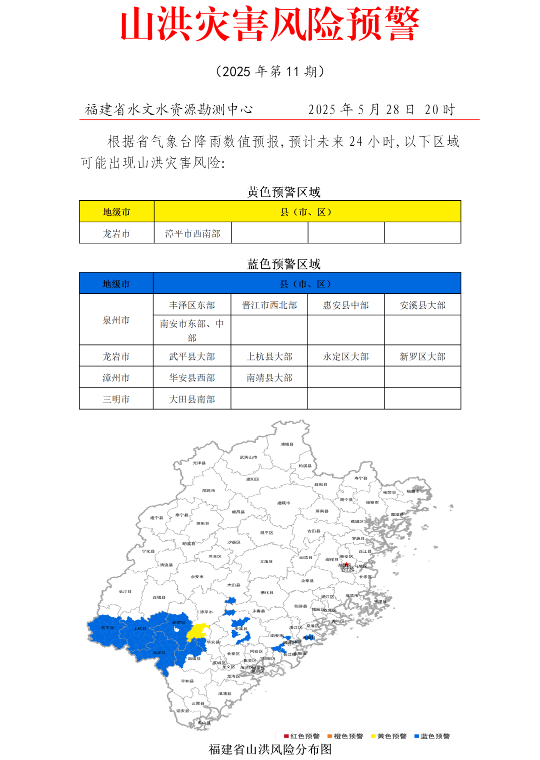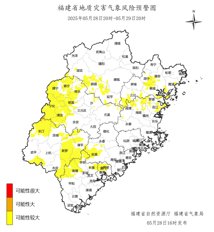 预计,5月28日20时至5月29日20时,三明市宁化县,龙岩市长汀县等部分地区地质灾害气象风险等级为橙色预警,地质灾害发生可能性大,应做好值班值守、监测、巡查和防范,应按有关规定及时组织危险性较大的地灾隐患点和危险区域内的群众转移,确保人民生命安全。 福州市晋安区、闽侯县、连江县、罗源县、闽清县、福清市,厦门市海沧区、集美区、同安区、翔安区,三明市三元区、沙县区、明溪县、清流县、尤溪县、将乐县、泰宁县、建宁县、永安市,泉州市安溪县、永春县、南安市,漳州市芗城区、长泰区、南靖县、平和县、华安县,南平市延平区、建阳区、顺昌县、邵武市、建瓯市,龙岩市新罗区、永定区、上杭县、武平县、连城县、漳平市,宁德市蕉城区、霞浦县、古田县、周宁县、福安市等部分地区,地质灾害气象风险等级为黄色预警,地质灾害发生可能性较大,应加强对地质灾害隐患点的监测和对高陡边坡、易发泥石流的沟口等易发区的巡查和防范,如果发现地灾险情应及时采取防灾避险措施,确保人民生命安全。 |