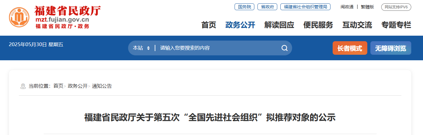 根据《民政部关于开展第五次“全国先进社会组织”评比表彰活动的通知》(民函〔2025〕22号)要求,按照党的建设突出、作用发挥突出、法人治理健全、社会形象良好、运作规范合法等评选标准,经审核、征求相关部门意见等程序,拟推荐福建省慈善总会、福建省兴业证券慈善基金会、福建省建筑业协会、福州市社会工作联合会、厦门市慈善总会、晋江市慈善总会、邵武市春暖社会工作服务中心等7家社会组织参评(简要事迹见附件),现予公示,公示时间为2025年5月29日至6月5日。公示期间如有异议,请通过来电、来信向省民政厅反映。
