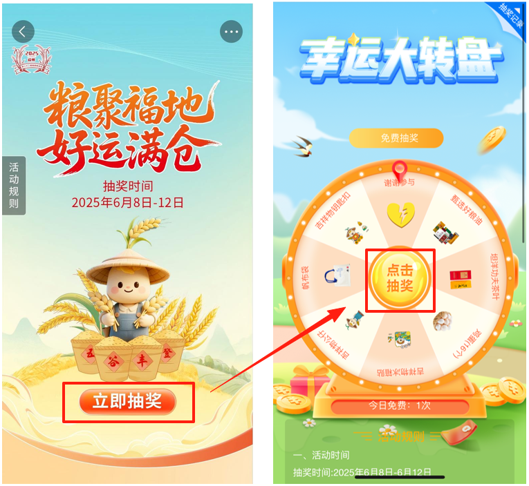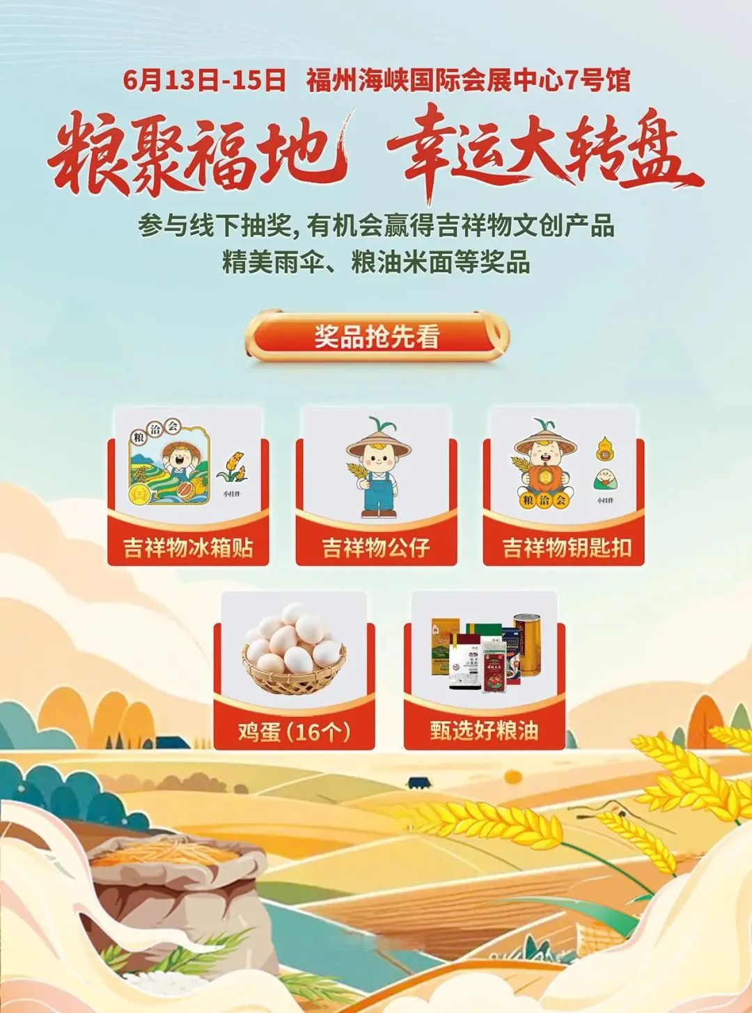 用户进入活动页面后,点击 “立即抽奖” 按钮,参与大转盘抽奖,有机会获得幸运奖品。 兑奖需知: ① 用户需要在 6月13日12:00-17:00、6月14日8:00-17:00、6月15日8:00-12:00 ,前往 福州海峡国际会展中心(7号馆)福建展区 奖品兑换点,凭借“抽奖记录”页面中奖信息及手机号,经工作人员确认核销后,即可领取实物奖品。 ② 若用户在指定兑奖时间内无法至现场兑奖,则视为主动放弃,逾期自动作废。 02 线下活动 “粮聚福地 幸运大转盘”线下抽奖 6月13日 中午12:00 -6月15日