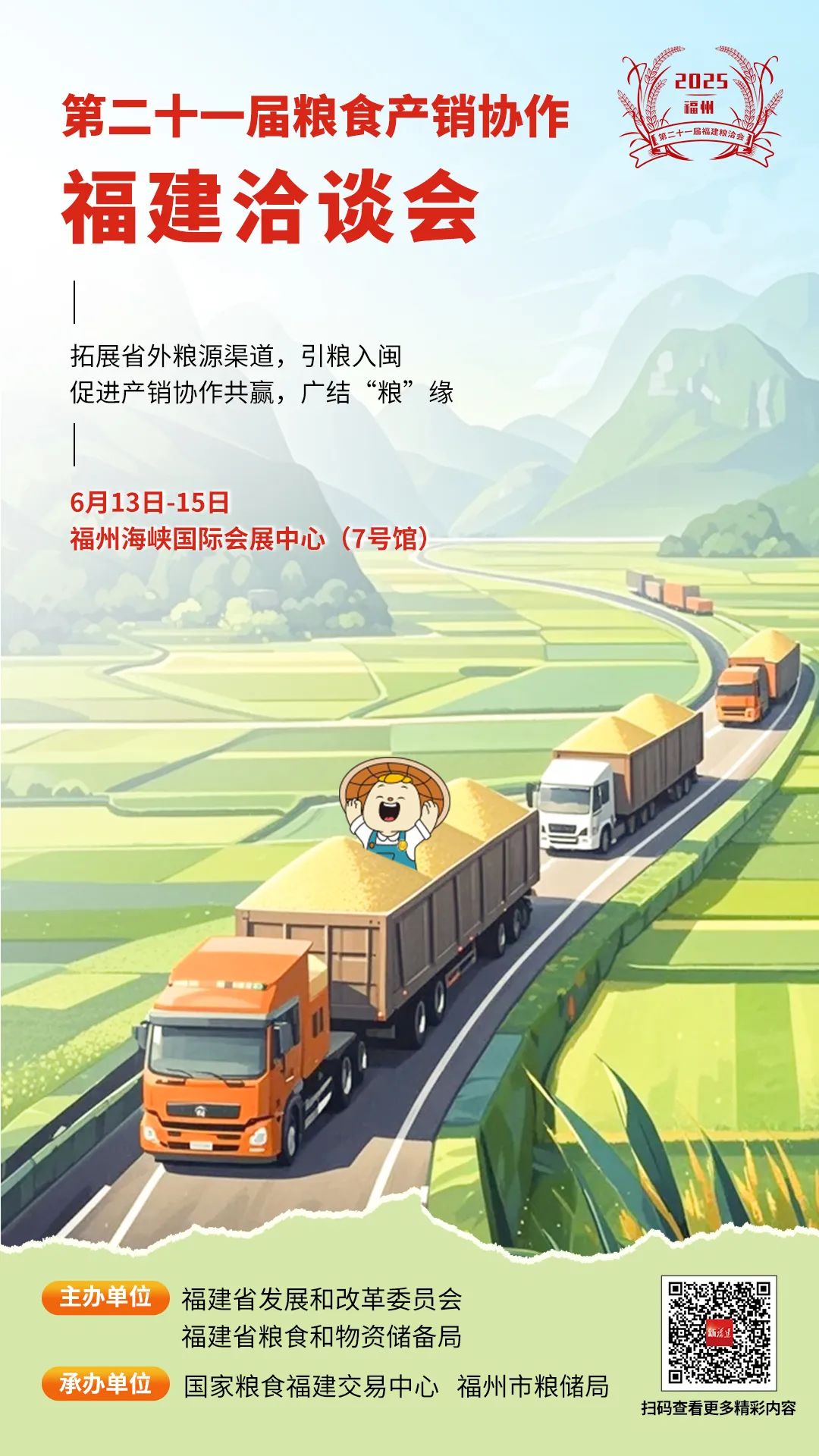 优质大米飘香、美味水饺诱人、爽口拌粉开胃…… 6月13日-15日, 一场粮食盛会——以 “全方位践行大食物观,构建粮食安全新格局” 为主题的 第二十一届粮食产销协作福建洽谈会 (简称"粮洽会"),将在 福州海峡国际会展中心7号馆 ,邀您见证“粮”辰美景。 这不仅是一场味觉的盛宴,更是贯彻落实国家粮食安全战略的重要实践。 本次大会立足新发展阶段,以推动区域合作、促进山海协作为目标,吸引了来自福建、山东、江西、吉林、安徽、河南、黑龙江、湖南、江苏、湖北、内蒙古、宁夏、辽宁等13个省(区)粮储部门与粮食企业踊跃参与,并邀请另外两个主产省河北、四川,以及新疆、西藏等4个省(区)粮储部门参会。来自天南海北的粮储人齐聚榕城,共同绘就新时代粮食安全合作新图景。