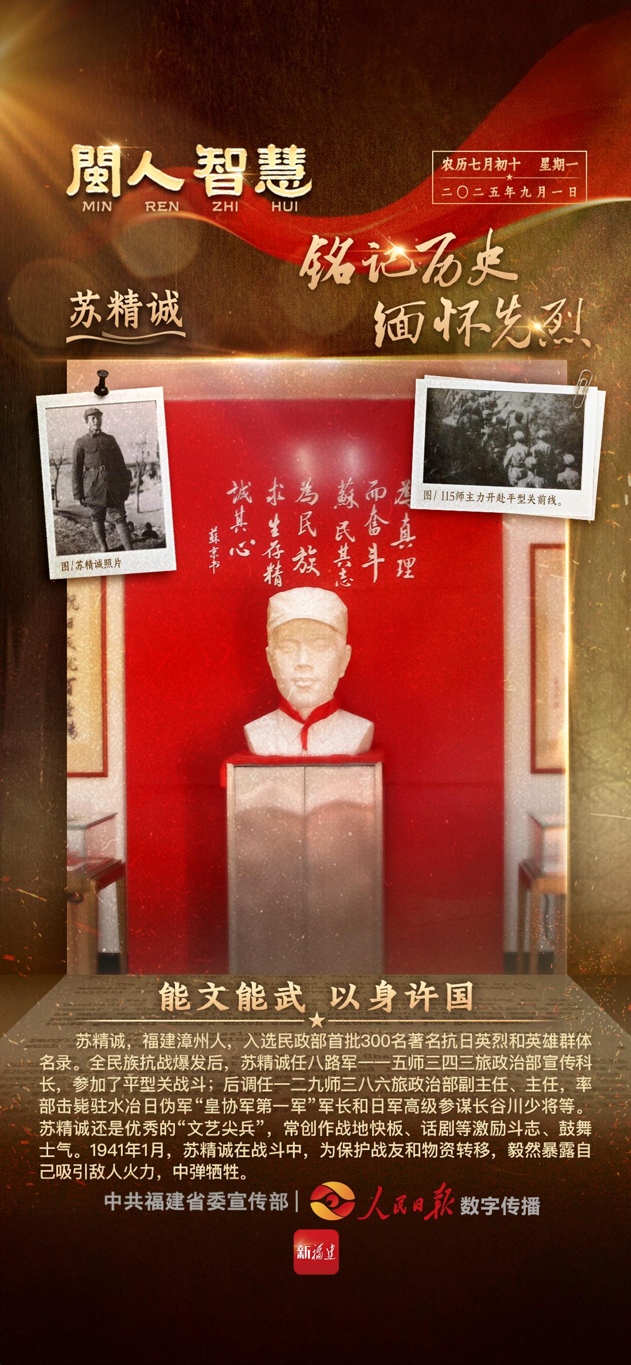 苏精诚,福建漳州人,入选民政部首批300名著名抗日英烈和英雄群体名录。全民族抗战爆发后,苏精诚任八路军一一五师三四三旅政治部宣传科长,参加了平型关战斗;后调任一二九师三八六旅政治部副主任、主任,率部击毙驻水冶日伪军“皇协军第一军”军长和日军高级参谋长谷川少将等。苏精诚还是优秀的“文艺尖兵”,常创作战地快板、话剧等激励斗志、鼓舞士气。1941年1月,苏精诚在战斗中,为保护战友和物资转移,毅然暴露自己吸引敌人火力,中弹牺牲。