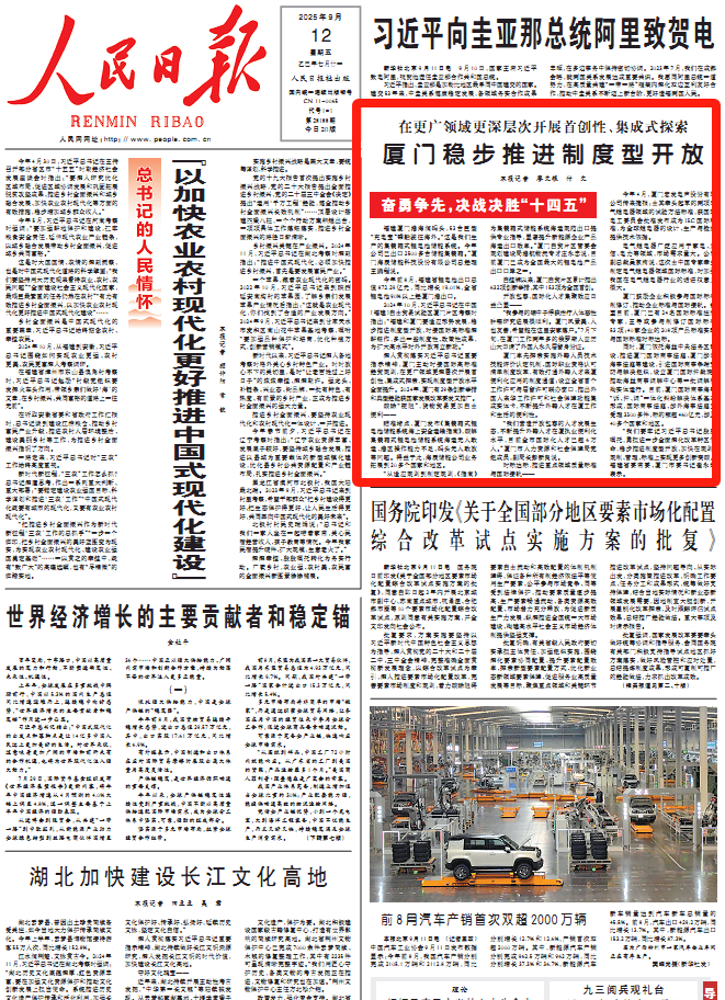9月12日,人民日报头版“奋勇争先,决战决胜‘十四五’”专栏刊登通讯《厦门稳步推进制度型开放》,点赞厦门主动对接国际高标准经贸规则,在更广领域更深层次开展首创性、集成式探索,实现制度型开放水平全面提升。