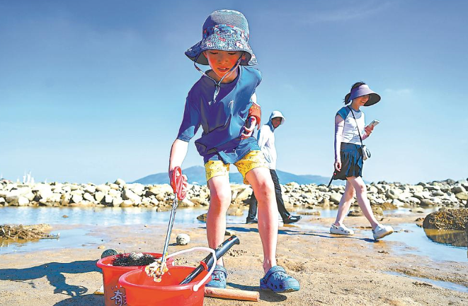 在平潭苏平片区白沙村附近沙滩上,一名小游客正在体验“赶海”。 江信恒 摄