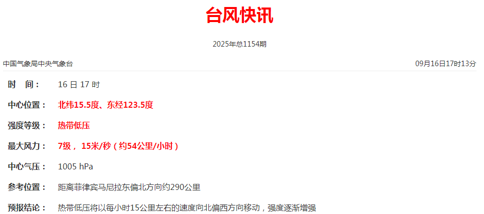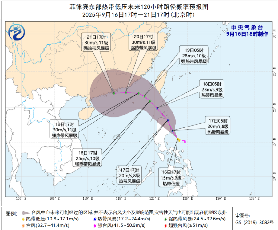 预计,热带低压将以每小时15公里左右的速度,向北偏西方向移动,强度逐渐加强,有可能于16日夜间到17日加强为今年第17号台风,而后趋向华南沿海。