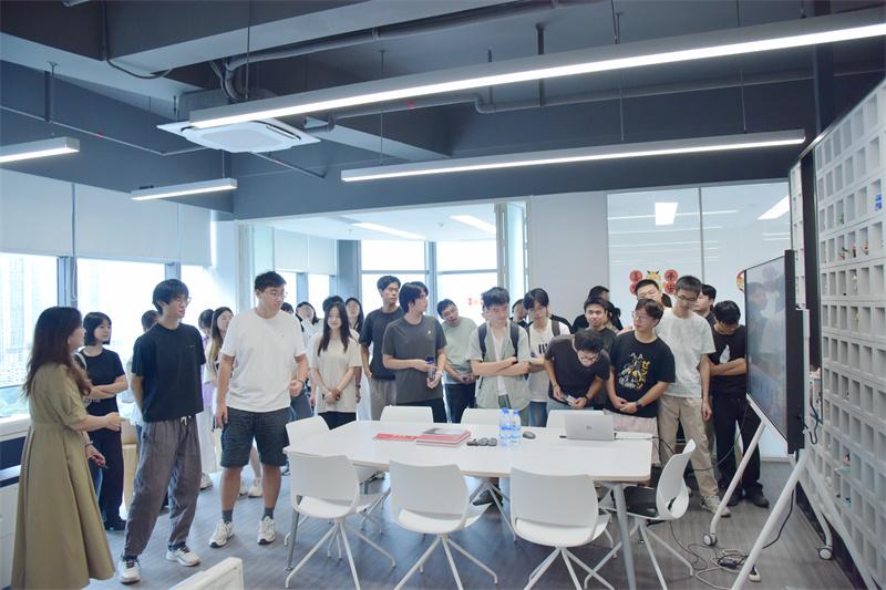 交流结束后,同学们移步企业展厅参观学习,在讲解员的带领下,详细了解福建设计历史沿革、发展定位、企业愿景,并集中观看了企业形象片,增进对公司企业文化、科研创新、项目作品的初步认识。