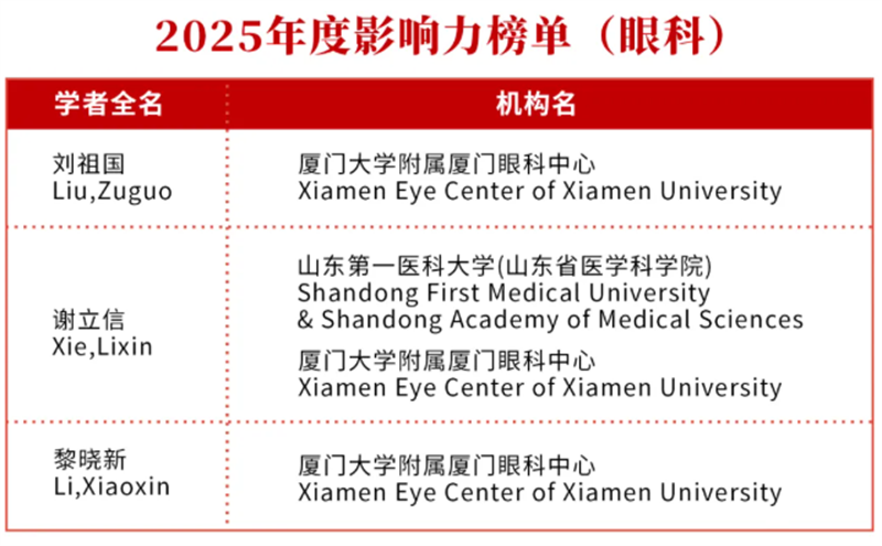厦门眼科中心总院长黎晓新教授已连续多年跻身斯坦福全球顶尖科学家“终身影响力”与“年度影响力”双榜单,持续向国际眼科学领域传递中国科研力量。