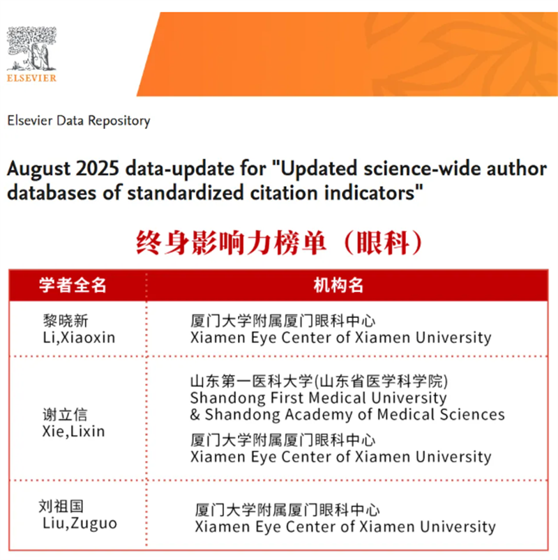 2025 年 9 月 19 日,美国斯坦福大学发布了“2025 年度全球前2%顶尖科学家榜单(World's Top 2% Scientists 2025)”。国际眼科科学院院士、厦门眼科中心总院长黎晓新教授,国际眼科科学院院士、厦门眼科中心名誉院长刘祖国教授,中国工程院院士、厦门眼科中心院士工作站导师谢立信教授,3人共同入选“终身科学影响力榜单”及“2025年度影响力榜单”,彰显了我院在全球眼科领域的卓越科研实力。