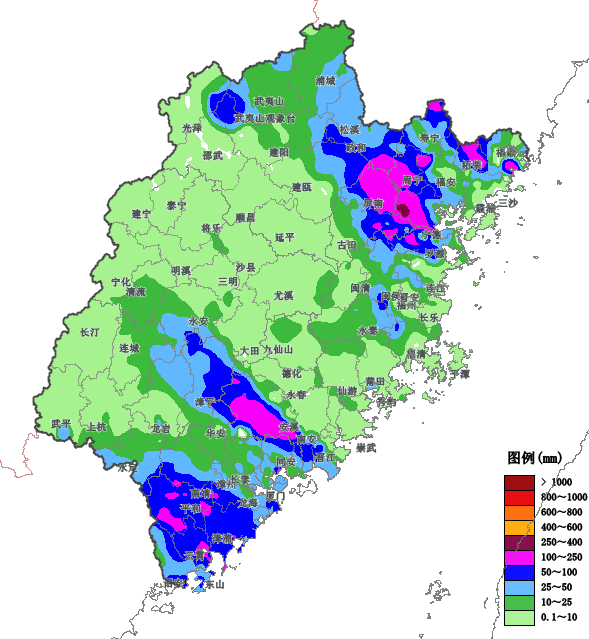 昨天(23日),北部和南部沿海地区部分出现暴雨到大暴雨,局部特大暴雨,其余地区局部出现暴雨到大暴雨。统计23日08时~24日08时,共有31个县(市、区)169个乡镇超过50毫米,其中19个县(市、区)57个乡镇超过100毫米,以蕉城区虎贝镇269.4毫米为最大。