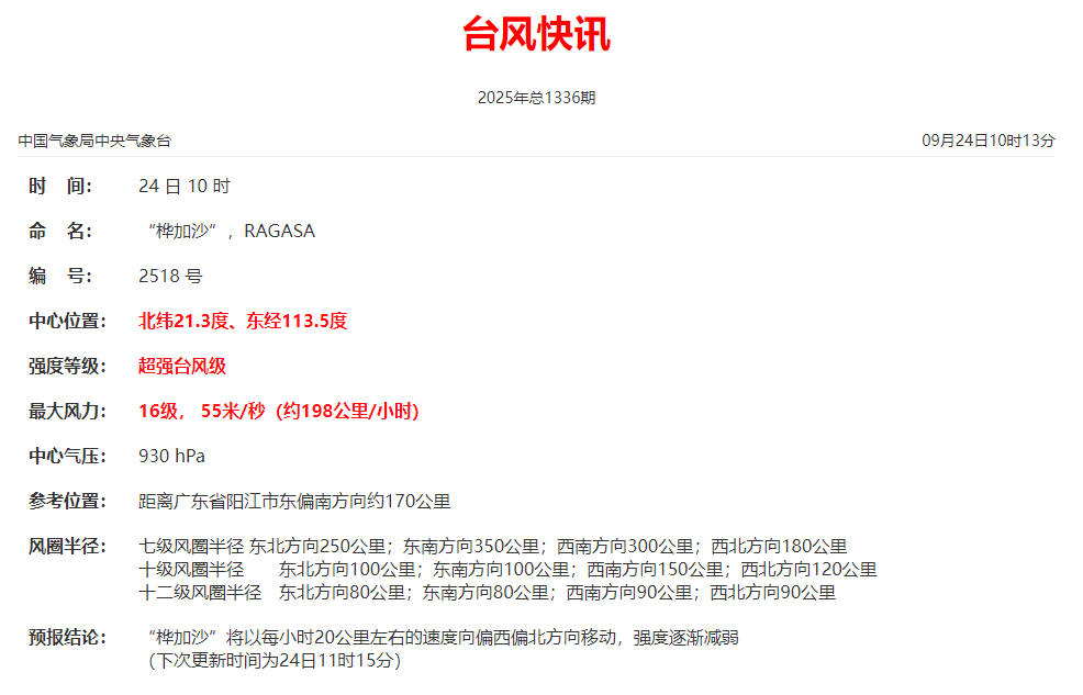 大风预报:24日14时至25日14时,巴士海峡、南海大部、西沙群岛、中沙群岛、南沙群岛、东沙群岛及黄岩岛附近海域、台湾海峡、台湾以东洋面、东海南部、北部湾、琼州海峡、福建南部沿海、广东南部地区及沿海、珠江口区、海南岛沿海、广西沿海将有6-9级大风、阵风10-11级,其中,广东中西部沿海、广西沿海和南海北部的部分海域或地区风力有10-13级、阵风14-15级,台风中心经过的附近海域或地区风力可达14-16级、阵风17级以上。