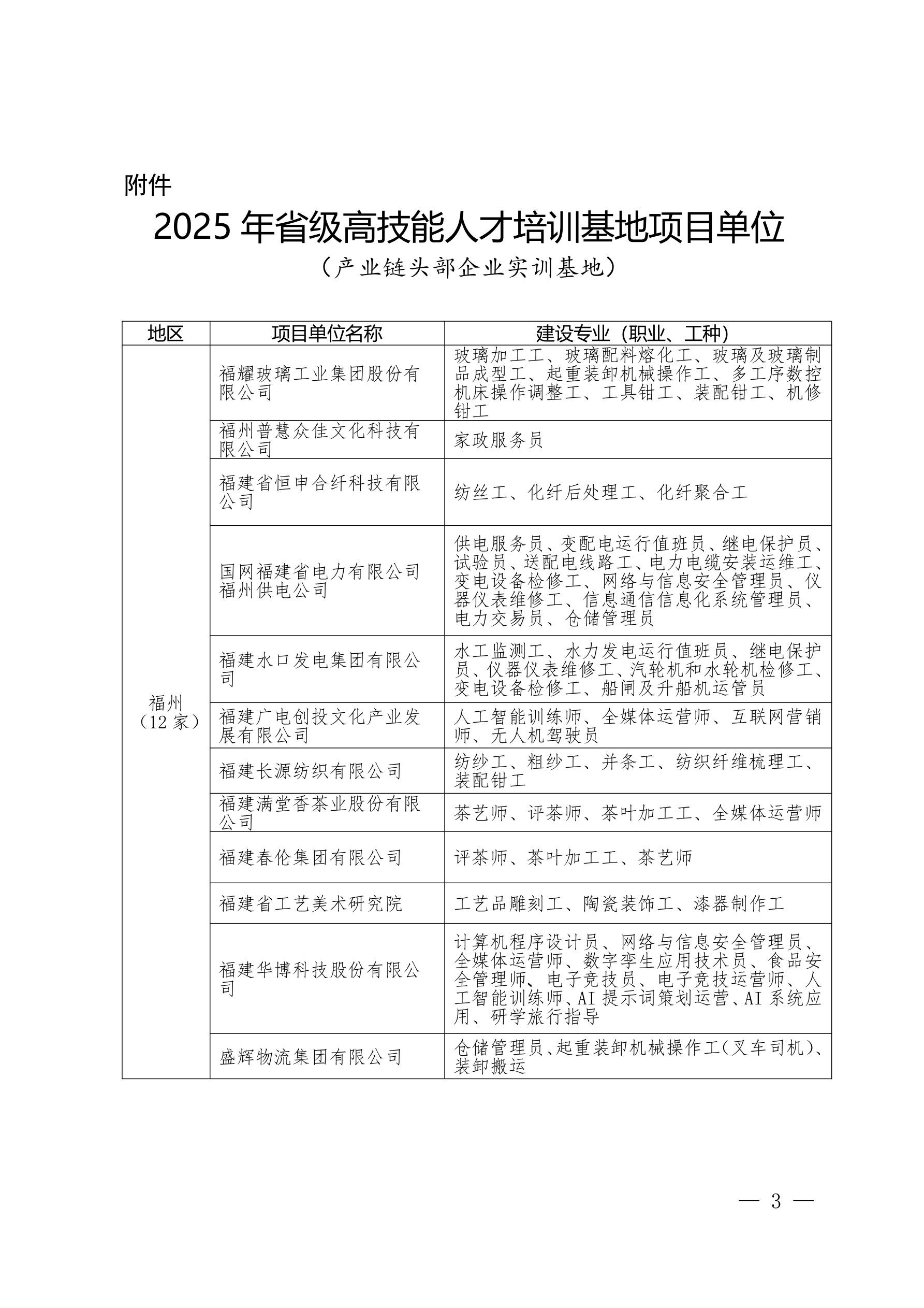东南网9月26日讯(本网记者 林夏悦)记者获悉,近日,省人社厅、省财政厅印发通知,确定福耀玻璃工业集团股份有限公司等70家单位为2025年产业链头部企业实训基地,其中家政、养老、护理服务类实训基地10家以上,基本形成覆盖各设区市和平潭综合实验区、各重点产业行业和我省急需紧缺工种的技能人才培养矩阵和推广网络。