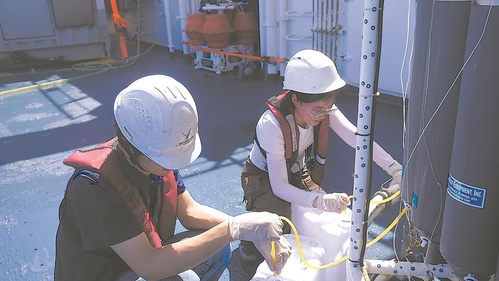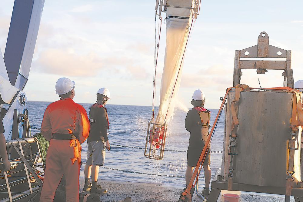 时间的指针拨回到今年7月底,在中国南海海域,夜幕下的科考船后甲板上仍有学生在忙碌。学生们各就各位,操作着CTD采水器(温盐深仪,是一种用于测量海水电导率、温度及深度的海洋调查仪器)缓缓沉入海中。这个重达数百公斤的设备将潜入数千米深海,采集不同层位的海水样本。