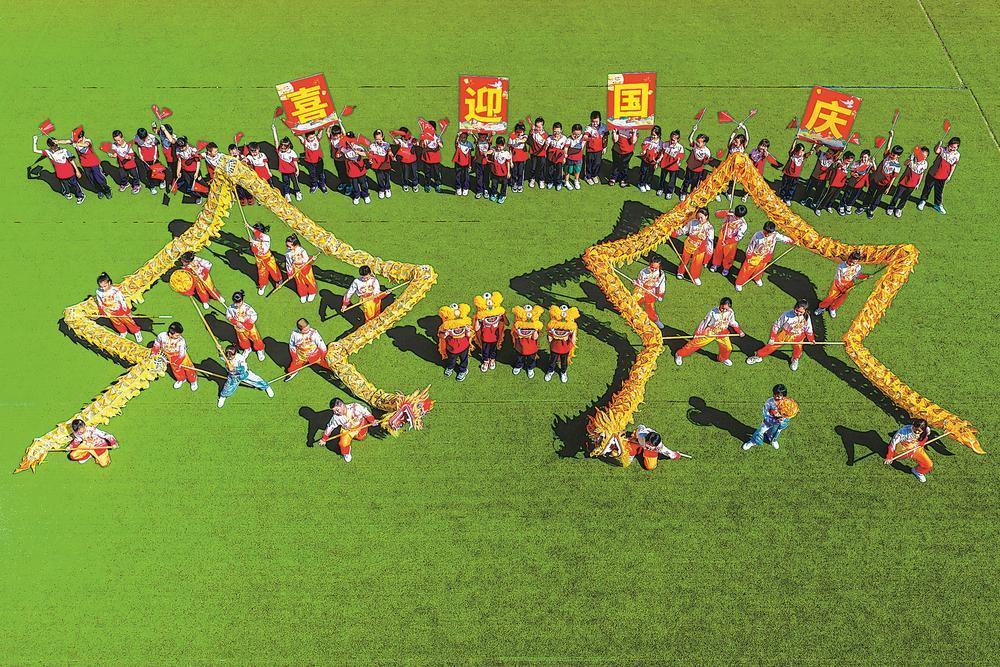 29日,福州市仓山区教师进修学校附属第一小学开展“喜迎国庆 祝福祖国”主题活动,师生通过舞龙舞狮表演、列队摆造型、与国旗合影等形式,表达对祖国的美好祝愿,喜迎国庆佳节。谢贵明 摄