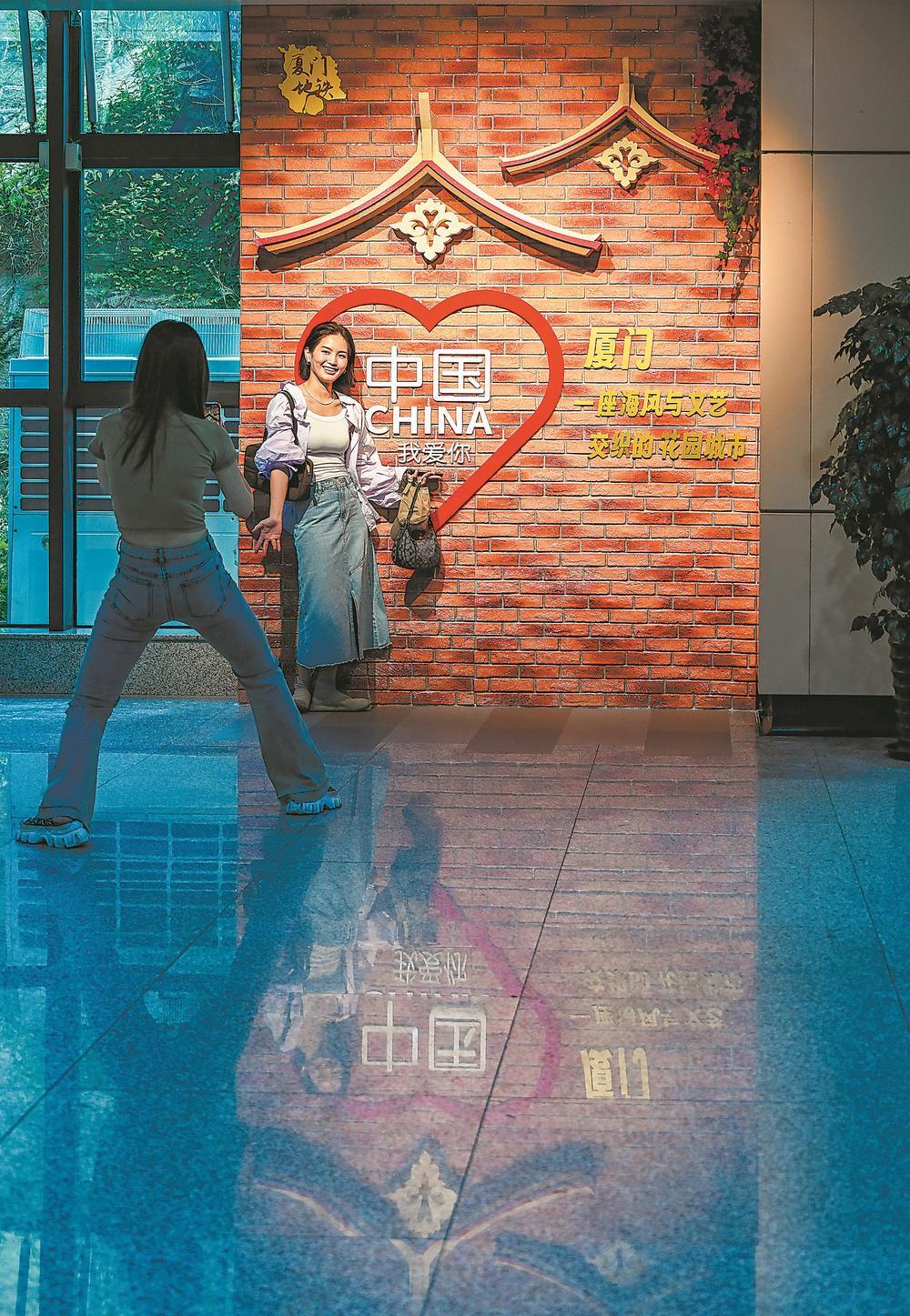国庆来临,厦门地铁在沿线作主题氛围布置。图为市民在厦门地铁1号线的布置点留影。林志杰 摄