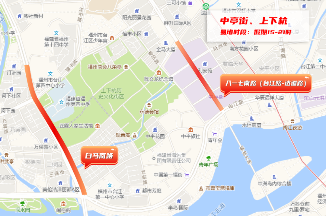 易堵路段为台江路,易堵时段为假期17—19时,高峰通行速度预计为20公里/小时,交通状态达到拥堵。
