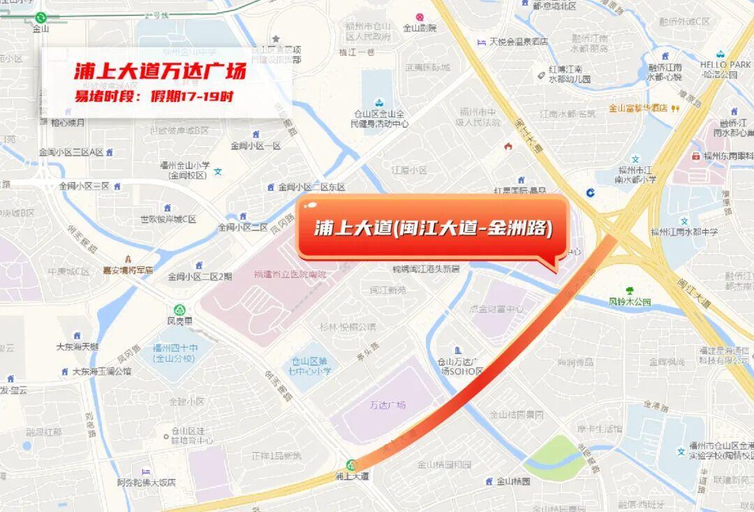 易堵路段为浦上大道(闽江大道—金洲路),易堵时段为假期17—19时,高峰通行速度预计为30公里/小时,交通状态达到拥堵。该路段拥堵时,易发生交通事故,请大家途经时注意控制车速,保持车距,谨慎驾驶。