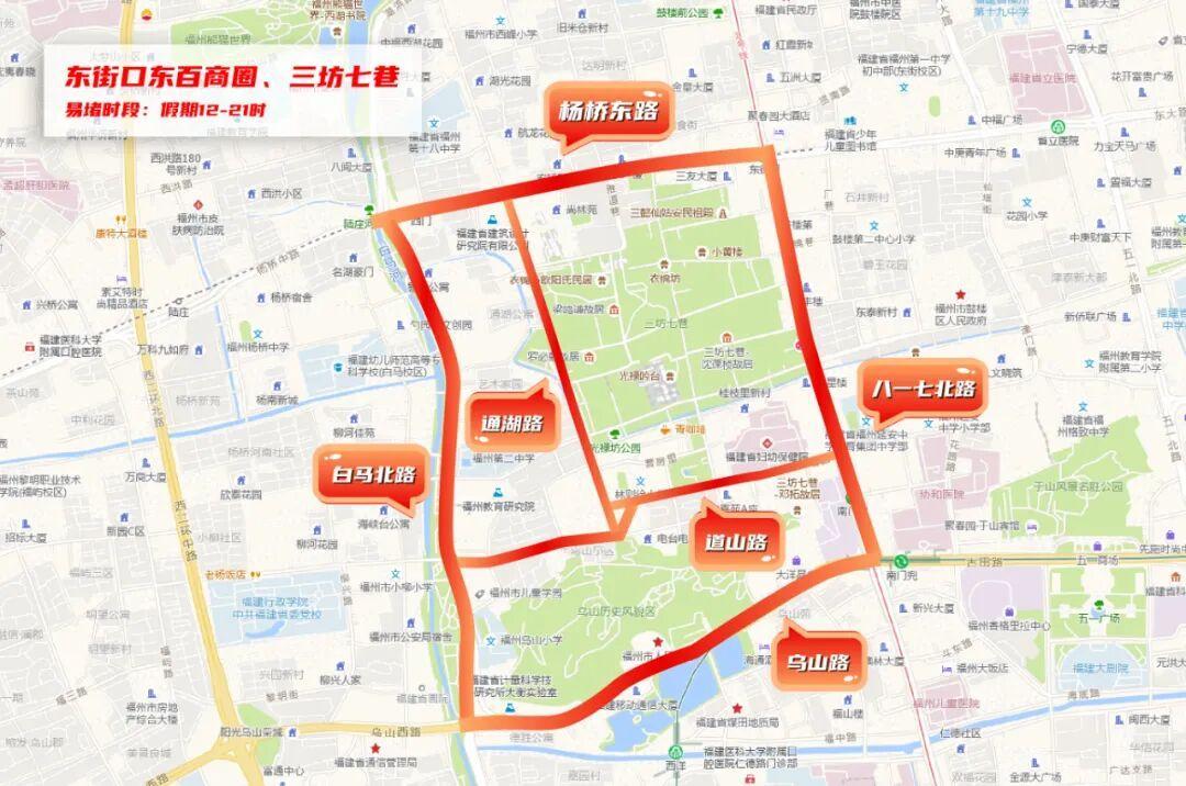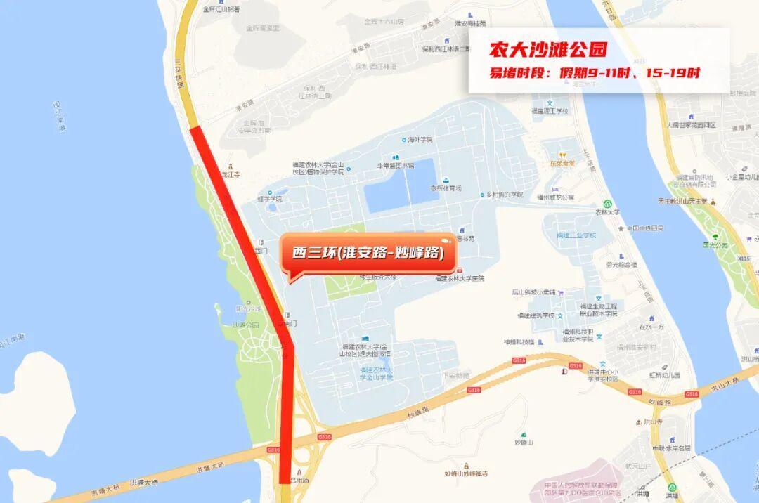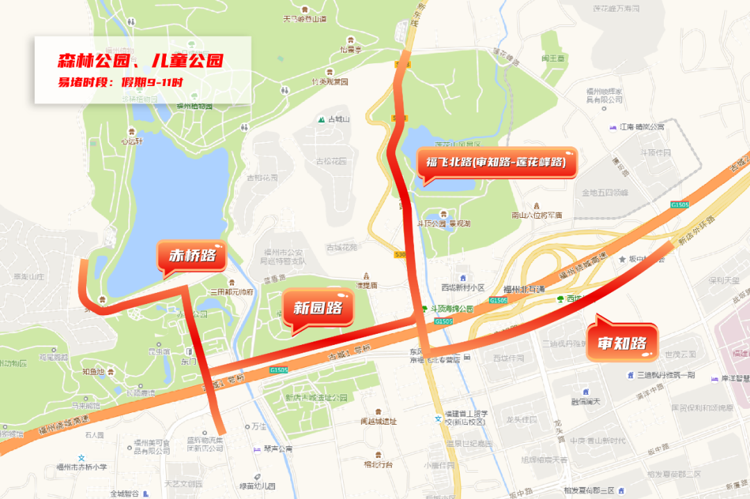 易堵路段为福飞北路(审知路—莲花峰路)、审知路、新园路、赤桥路,易堵时段为假期9—11时,高峰通行速度预计为20公里/小时,交通状态达到严重拥堵。