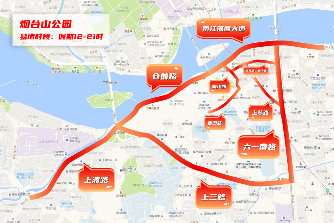 易堵路段为仓前路、上渡路、上三路、上藤路、六一南路、梅坞路、南江滨西大道、麦园路、观海路、观井路,易堵时段为假期12—21时,高峰通行速度预计为30公里/小时,交通状态达到严重拥堵。