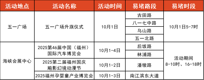 30日受工作日晚高峰叠加出城高峰影响,16—19时城区其他主次干道交通流量大幅上升,三环路、二环路、金山大道、福湾高架桥、南台大道、五四路、福飞路、化工路等极易发生拥堵。1—2日城区其他主次干道易堵时段为9—11时、16—19时,拥堵路段较平时大幅减少,集中在西二环、东二环、南二环、五四路等。