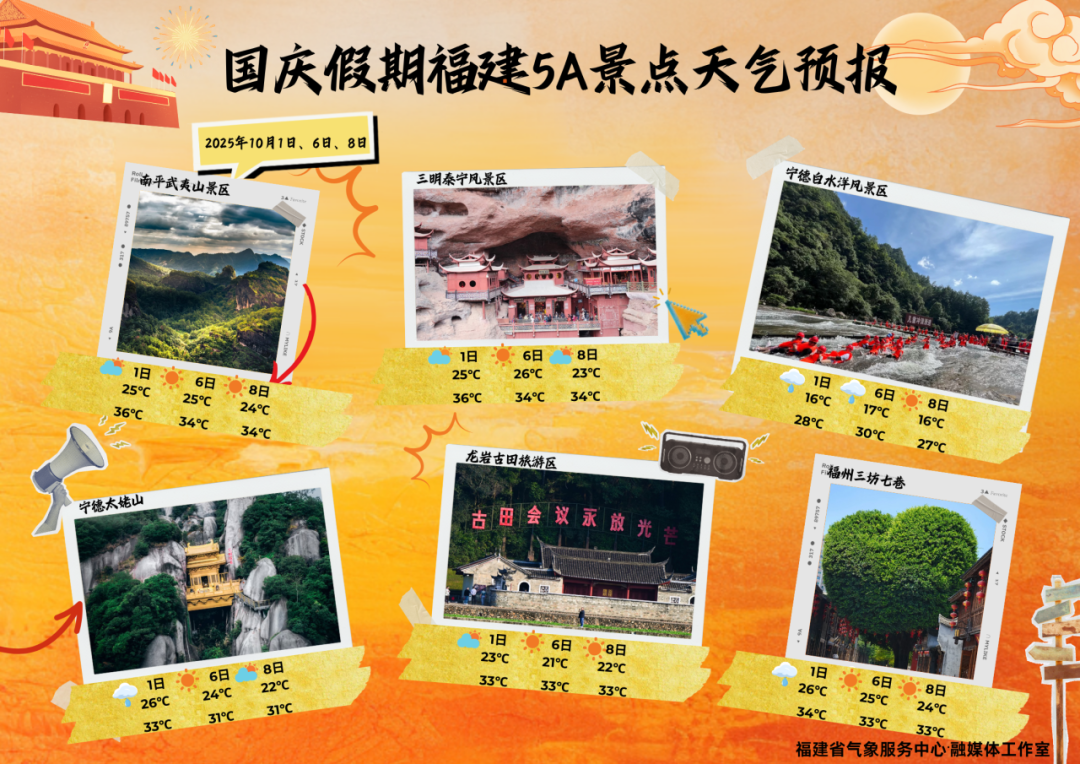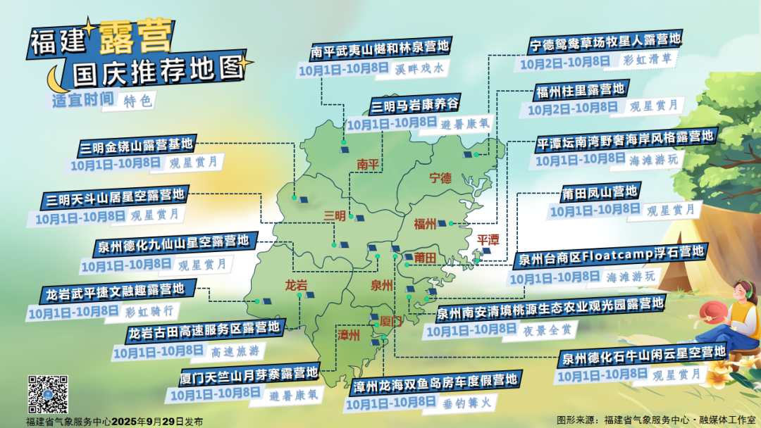 未来三天天气预报 今天(30日)到10月1日 全省多云,有分散性阵雨或雷阵雨 局部大雨 2日,全省晴到多云 局部有阵雨或雷阵雨 10月1-2日早晨 沿海和内陆山区部分有大雾 关注对户外活动和交通的不利影响 还需关注 雷雨和局地强对流天气的不利影响 气温方面 我省大部分地区最高气温在35℃上下 省会福州5日最高气温甚至达38℃ 气温高涨,体感闷热 国庆中秋假期期间天气适宜外出活动 但气温较高,需注意做好防晒防暑措施 谨防中暑 快看! 国庆假期福建露营推荐地图 |