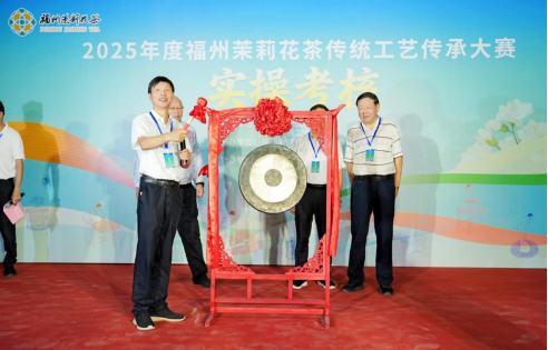 王贞锋表示,本届大赛不只是手艺人之间的技艺较量,更是一场茉莉茶香里的文化盛宴,一次非遗传承人才的集中检阅,更是推着福州茉莉花茶产业往更高处走的关键契机。期待大家拿出最佳状态,在赛场上亮出真本事、赛出高水准。随后敲响铜锣,正式拉开本次大赛实操考核的序幕。
